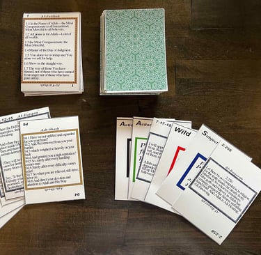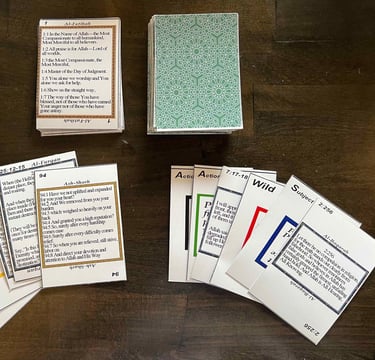 This card game is fun and helps members discuss, reflect, and demonstrate their understanding of selected Quranic verses and short Surahs. The rules of the game are to be the first one without any cards in your hand or score the most points if you are playing multiple rounds. Players take turns reading their cards (the English meaning or Quranic verses), stating the message or the card, subject, and relating it to other cards in their hand or on the discard pile. This is a fun new way to get our kids connected to Allah's word.